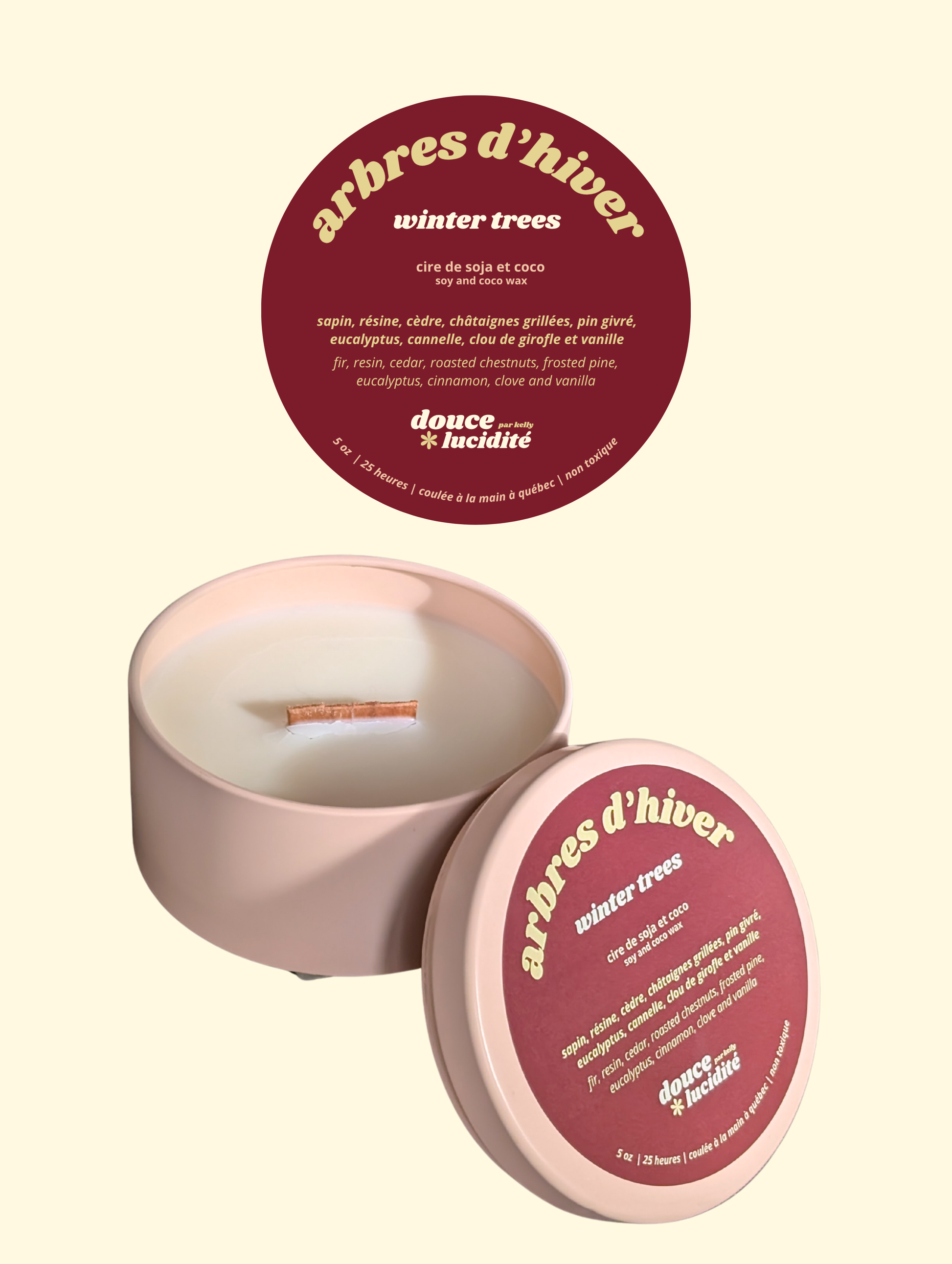 Cire 100% végétale de soya, coco et candelilla avec une large mèche en bois crépitante. Sans cruauté.